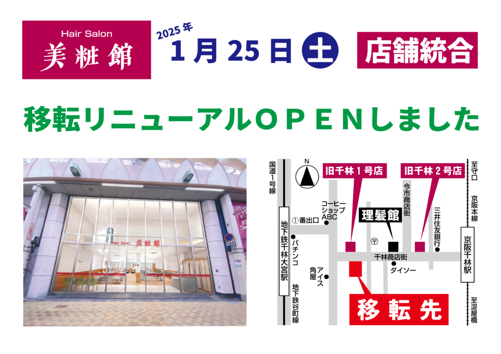 美粧館 千林1号店、美粧館 千林2号店は、ゆったりとした大型店舗の 美粧館 千林店 として移転リニューアルOPENしました。